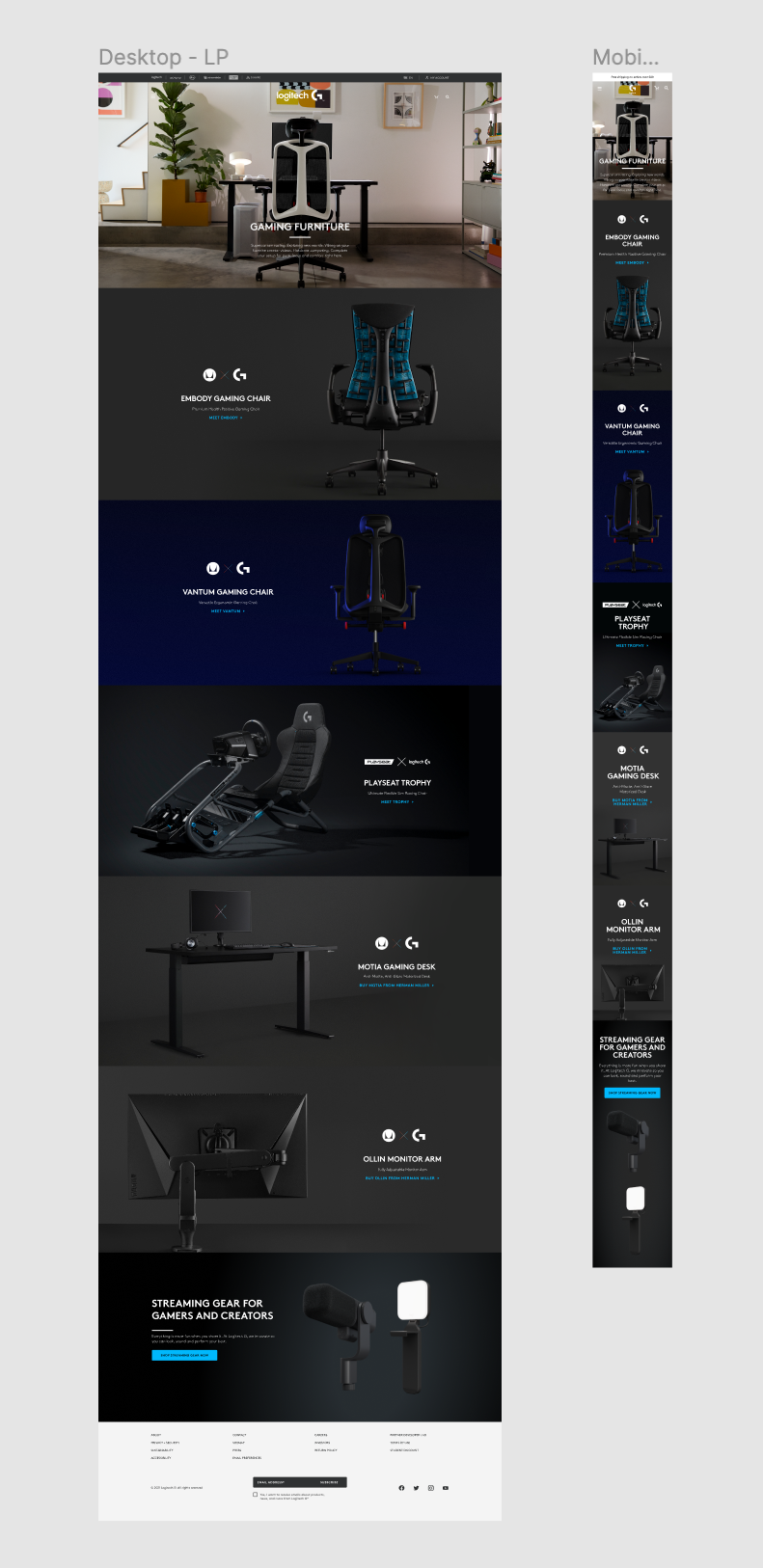 The Logitech gaming furniture landing page is an excellent example of effective UI/UX design for a product range targeted towards a specific audience. The dark color scheme, large typography, and high-quality images make the landing page visually appealing, while the product comparison and configurator features enhance the user experience. By conducting user testing and making optimizations, we created a landing page that meets the needs of Logitech’s target audience and effectively showcases their gaming furniture range.