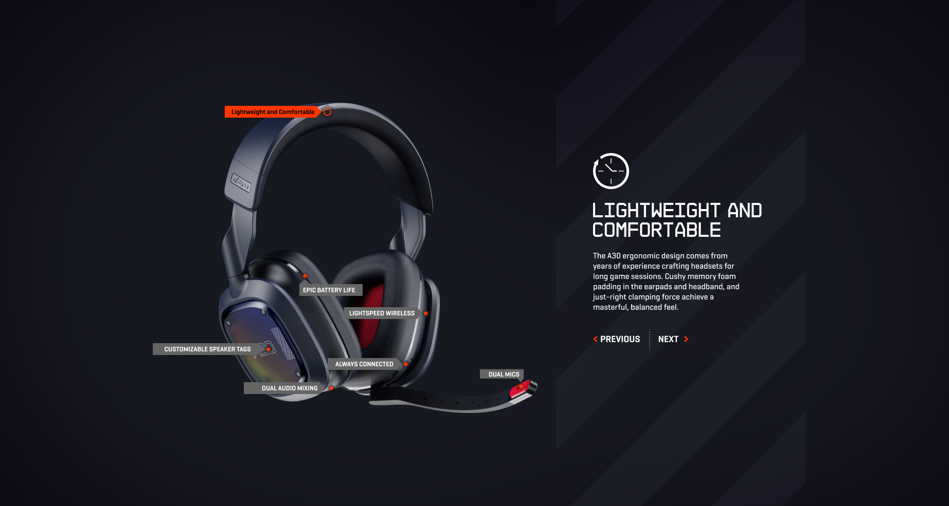 The latest from ASTRO and greatest collab with Logitech G introduced its latest product called the A30 wireless headset, the A30 a new gaming headset compatible with Xbox, PlayStation, and PC. The new headset comes with a set of unique features such as 24GHz and Bluetooth wireless connectivity, add-on adjustable boom mic, and a mobile app to provide excellent sound quality. The A30 product page needed to be creatively different from the other Astro headsets, well-designed and optimized to showcase the cross compatibility features of the A30 wireless headset effectively.